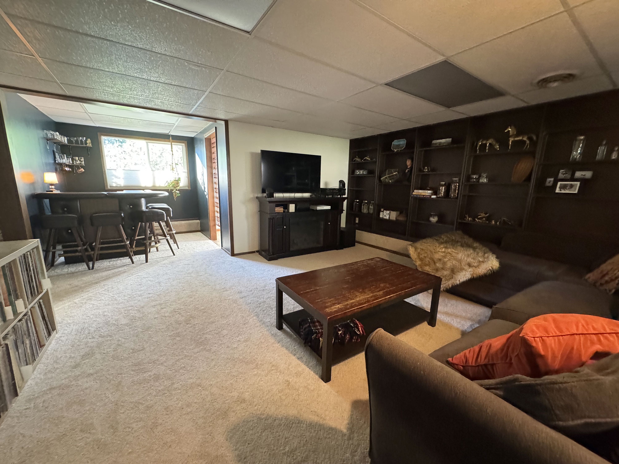 The downstairs bonus room opens up to a spacious covered patio that leads to the hot tub.